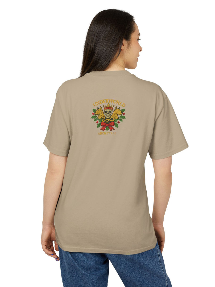 This heavyweight street tee reads like armor for city nights. The UNDERWORLD crest—ornate baroque scrollwork lacquered in deep noir with molten-gold trim—dominates the back, offering a quiet, deliberate presence that suits launch drops, late shows, and layered streetwear. The 100% carded cotton body (7.1 oz/yd²) keeps prints crisp while feeling soft against the skin. Thoughtful construction—twill shoulder tape, double-needle seams, ribbed collar and seamless tubular knit—maintains a sharp, boxy silhouette wash after wash. Dropped shoulders and an oversized fit make it easy to layer under varsity jackets or over hoodies, while dual printing and optional embroidery preserve fine detail across back graphics and smaller sleeve or neck accents. Finished with a tear-away label and garment-dyed wash for authentic faded edges, this tee is for adults who move through urban shadows and value craft over flash.